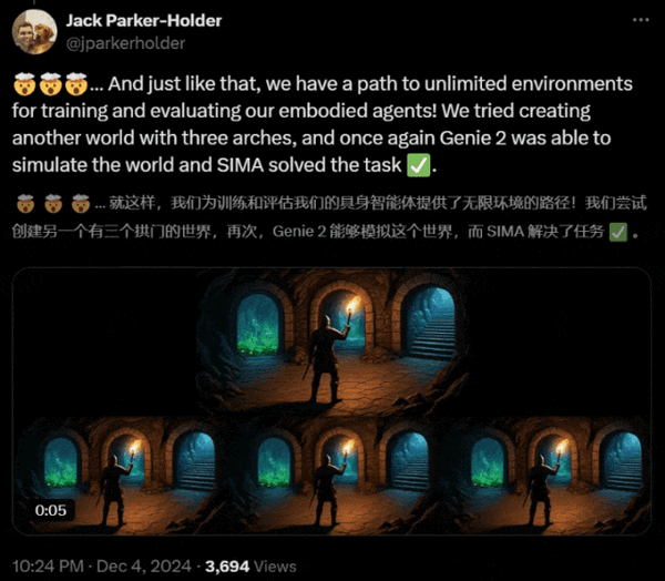有人被这手艺前进的速度震动,Genie 2仍然很好地舆解了指令并生成了研究人员想要的3D动图。以至还有人看到了一切都被虚拟化的世界模子的更久远将来。此中,谷歌还暗示,马斯克则答复:Cool。以至正在物体视角分歧性和场景回忆方面表示优异。
